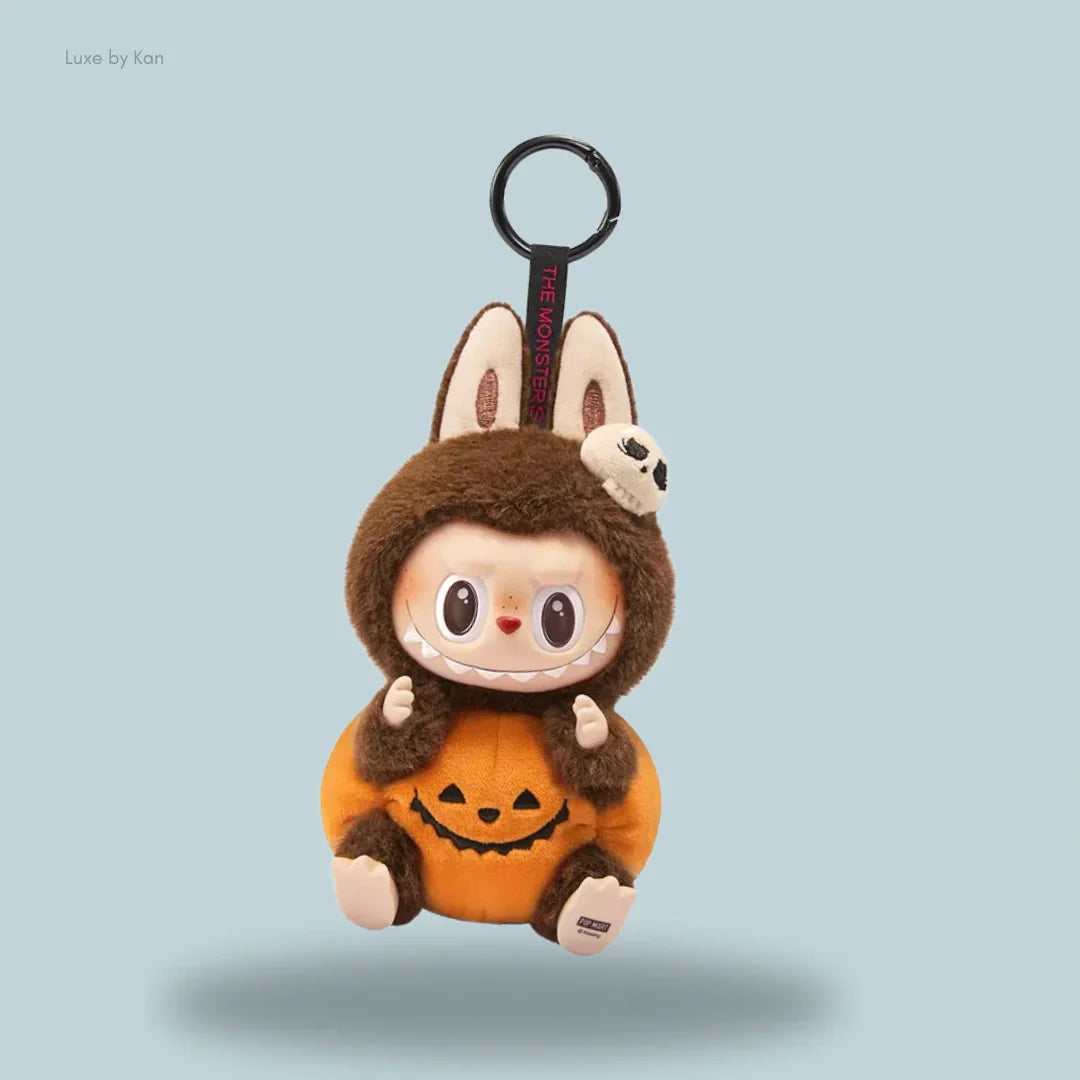Dressed like a cozy little jack-o'-lantern, Labubu is all set for Halloween fun. This adorable vinyl plush pendant features a soft pumpkin-orange plush suit and Labubuโs signature vinyl face โ full of mischief, charm, and festive spirit.